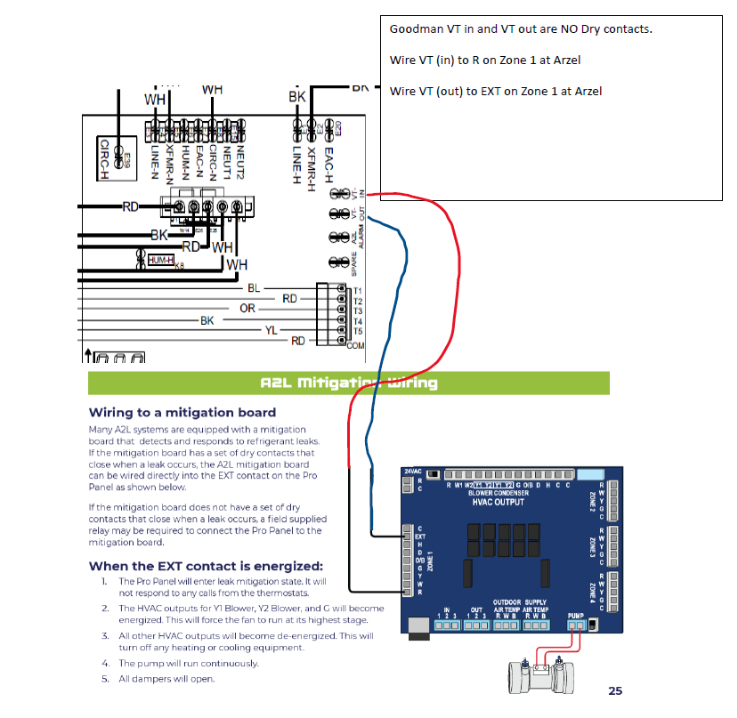 Attached is a wiring diagram along with Sequence of operation when using Arzel zoning on Goodman R32 Furnaces. The Dragon Fly mitigation control would wire into the Arzel the same way as it also has the V (in) and V (out) terminals. NOTE: Arzel PAN-PRO panels ONLY!