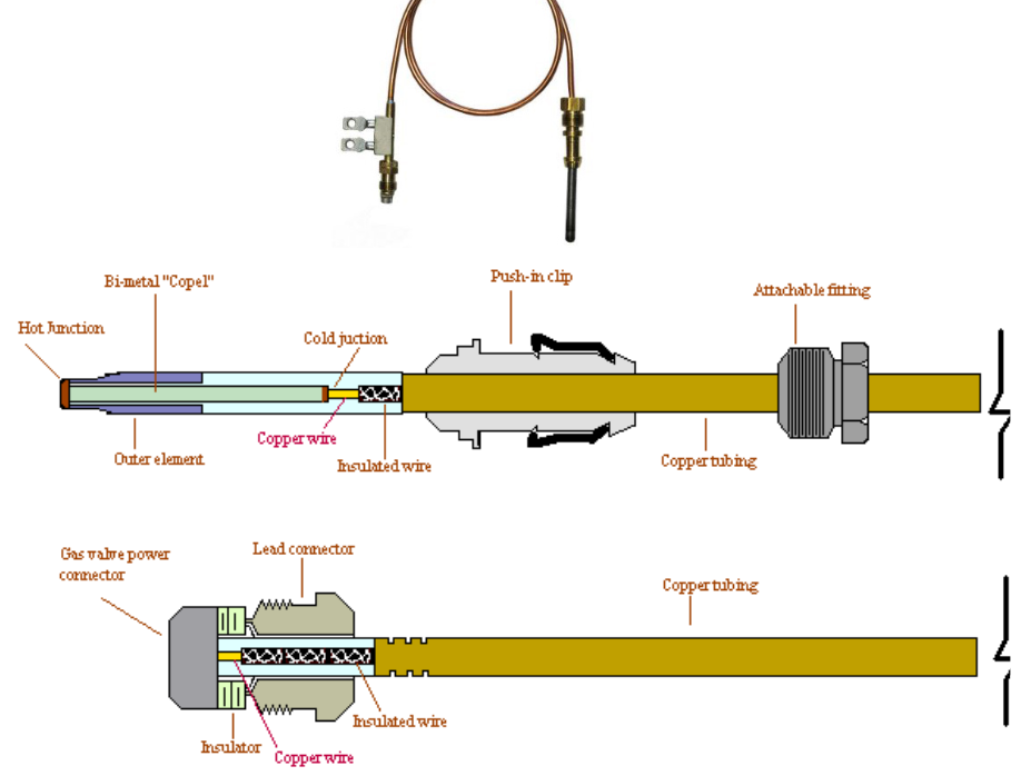 joined together at a ‘hot junction’ or welded tip. When the hot junction is heated by the pilot light to