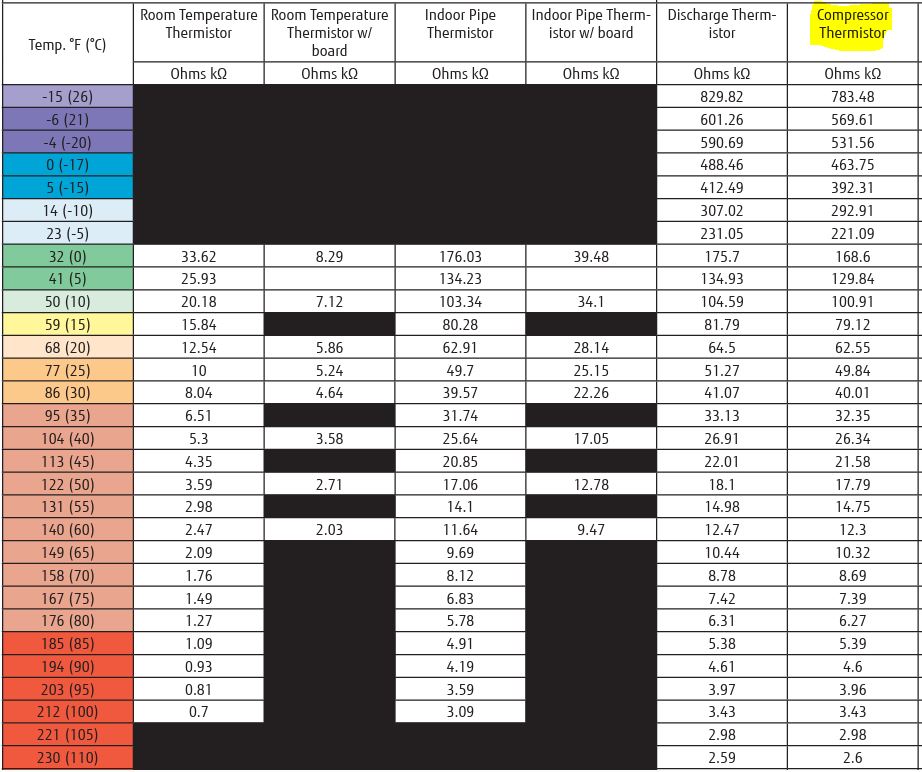 If fan ohms correctly, check the resistance of the Compressor Thermistor by ohming it out. See attached Thermistor Resistance Chart.