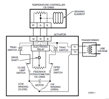 In this illustration, we see that the sensing element mechanically moves the wiper designated by R. Voltage from the transformer flows through R and out the path of least resistance. The corresponding triacs energize a winding to move the motor. The feedback potentiometer signals the balance relay of the desired change of position and the windings de-energize. A typical sensing element connected to this system would expand as it got warm and contract as it cooled. The wiper moves toward W on temperature rise and toward B on temperature fall.