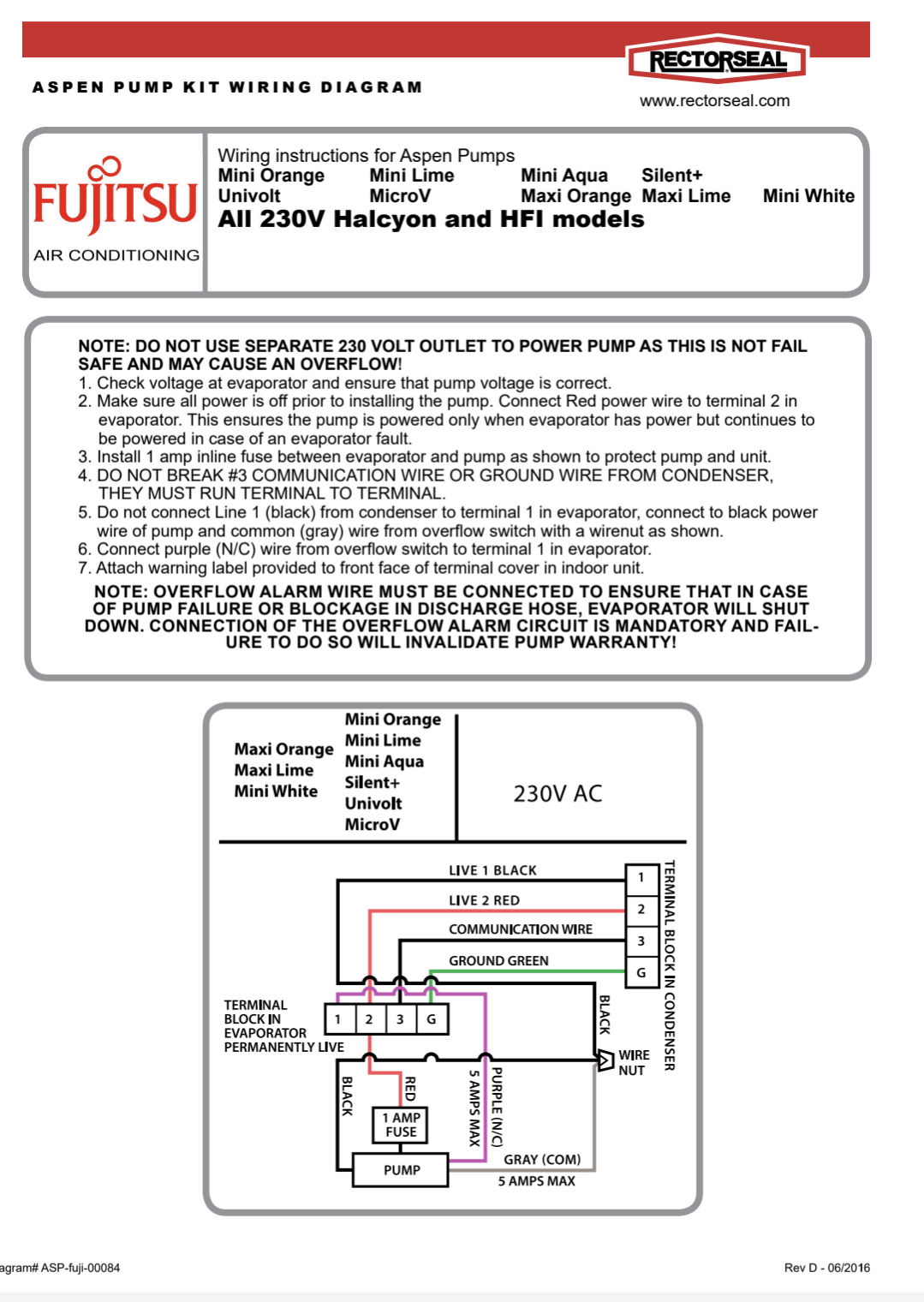 This is a wiring diagram for wiring Aspen pumps. Remember these pumps are only available in normally closed wiring, meaning the leg opens when alarm is triggered. If you are installing Fujitsu VRF then consider the Refco branded pump that can do normally open contact.