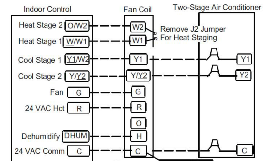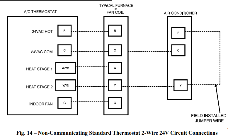 When installing ICP communicating equipment, it is possible to use non-comm thermostats with these systems. The control boards of both the indoor and outdoor sections will have terminal strips for "Legacy" connections (standard 24v wiring). Also on the control boards, you will see a plug in style connection with Dx+, Dx-, R, C. If you are going to install with a non-comm thermostat, you will NOT use the plug in connector, just the standard low voltage terminal strip with R, C, Y. Damage may occur if you use a non-comm thermostat on the DX+, DX- connections.