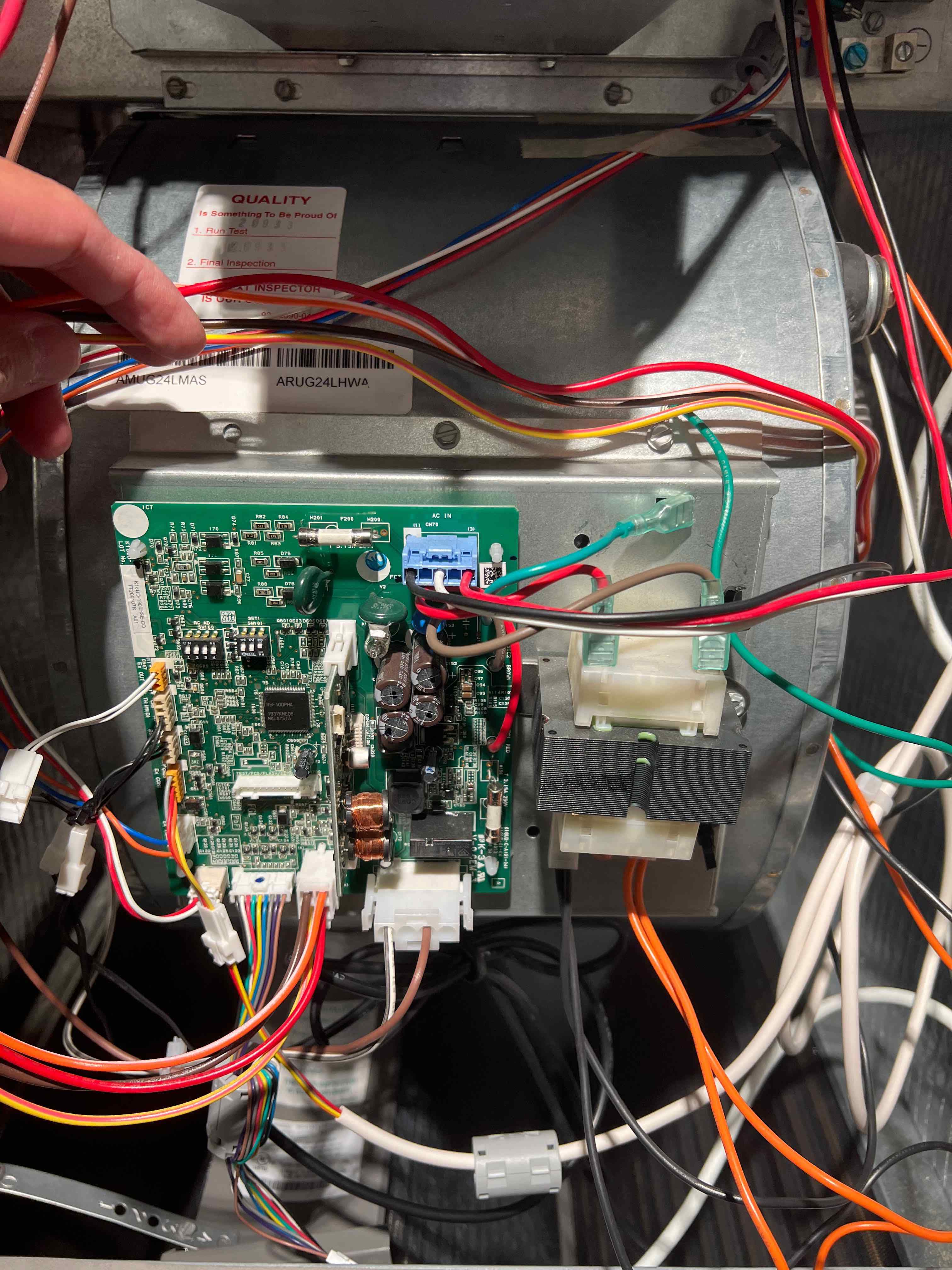 If you are experiencing error 51 codes on Fujitsu AMUG units, consider re-routing the fan motor wiring above the board as shown below. Interference can cause these issues. Of course do the fan motor testing first. This has caused multiple changeouts on fan motors.