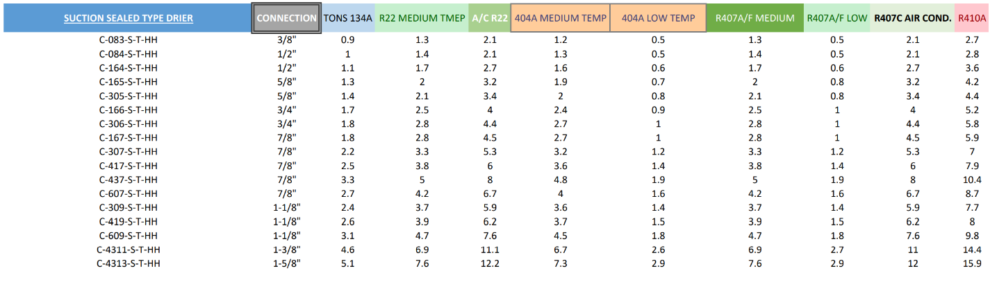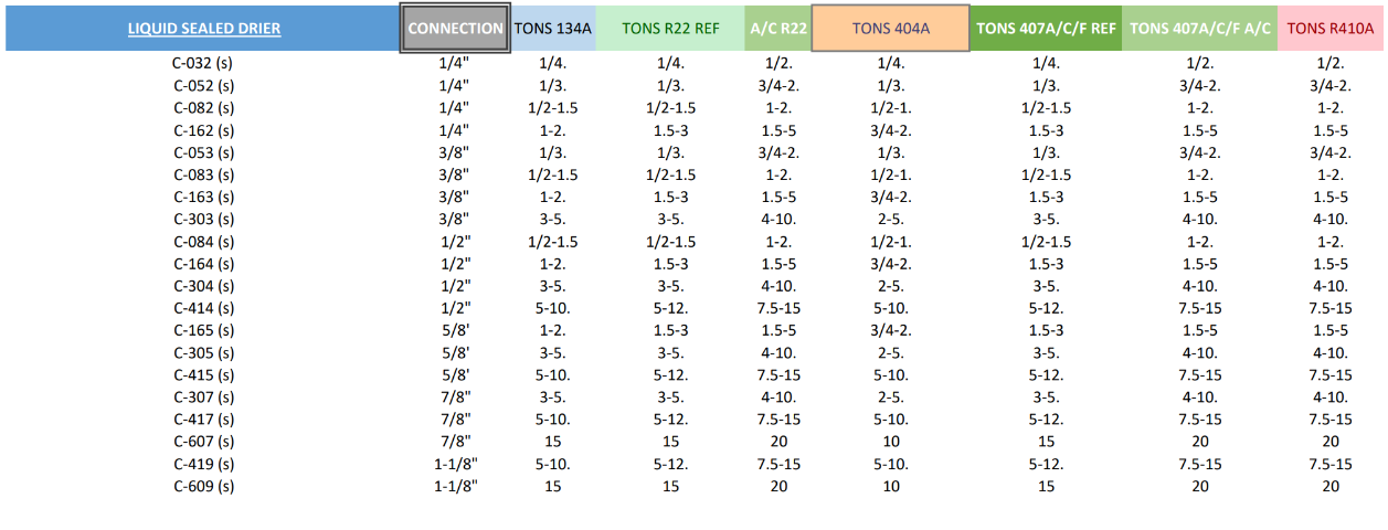 Attached is a chart for sizing up Sporlan sealed type driers. There are sperate charts for both suction and liquid line.