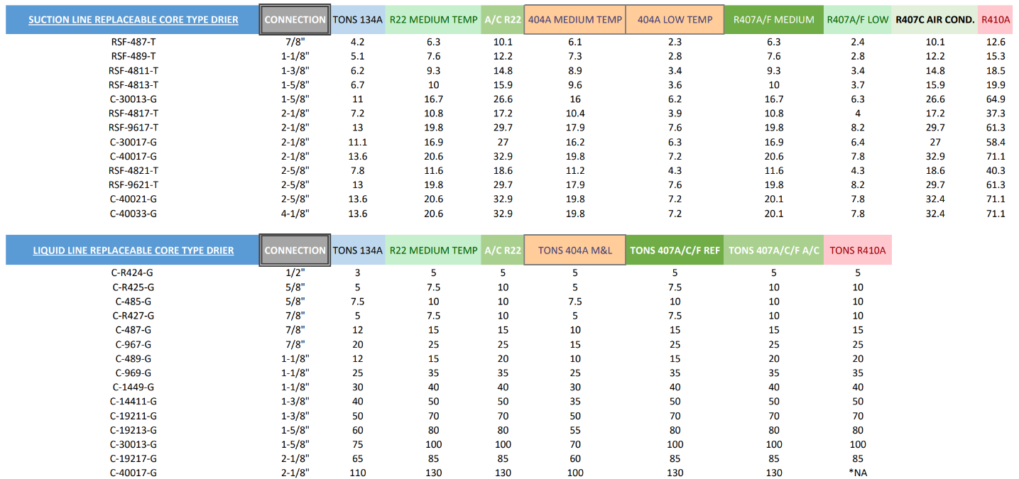 Below is a chart for sizing up Sporlan replaceable core type driers. You have both suction (top chart) and liquid line (bottom chart). Understanding the chart is simple. On the far left you will be given a Sporlan part number. To the right of that you will see the connection size for the corresponding part. Then following the chart further to the right you can verify the rating in TONS for each specific refrigerant type.