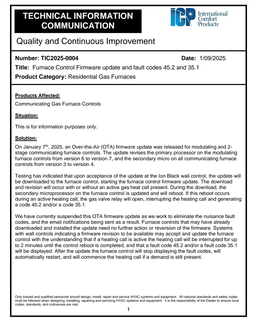 Home > HVAC Equipment Lines > ICP/Heil/Tempstar > ICP Bulletins > ICP TIC2025-0004 Furnace Firmware Update