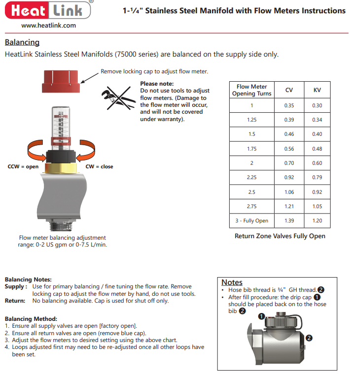 Remove locking cap to adjust the flow meter by hand, do not use tools. Return: No balancing available. Cap is used for shut off only.